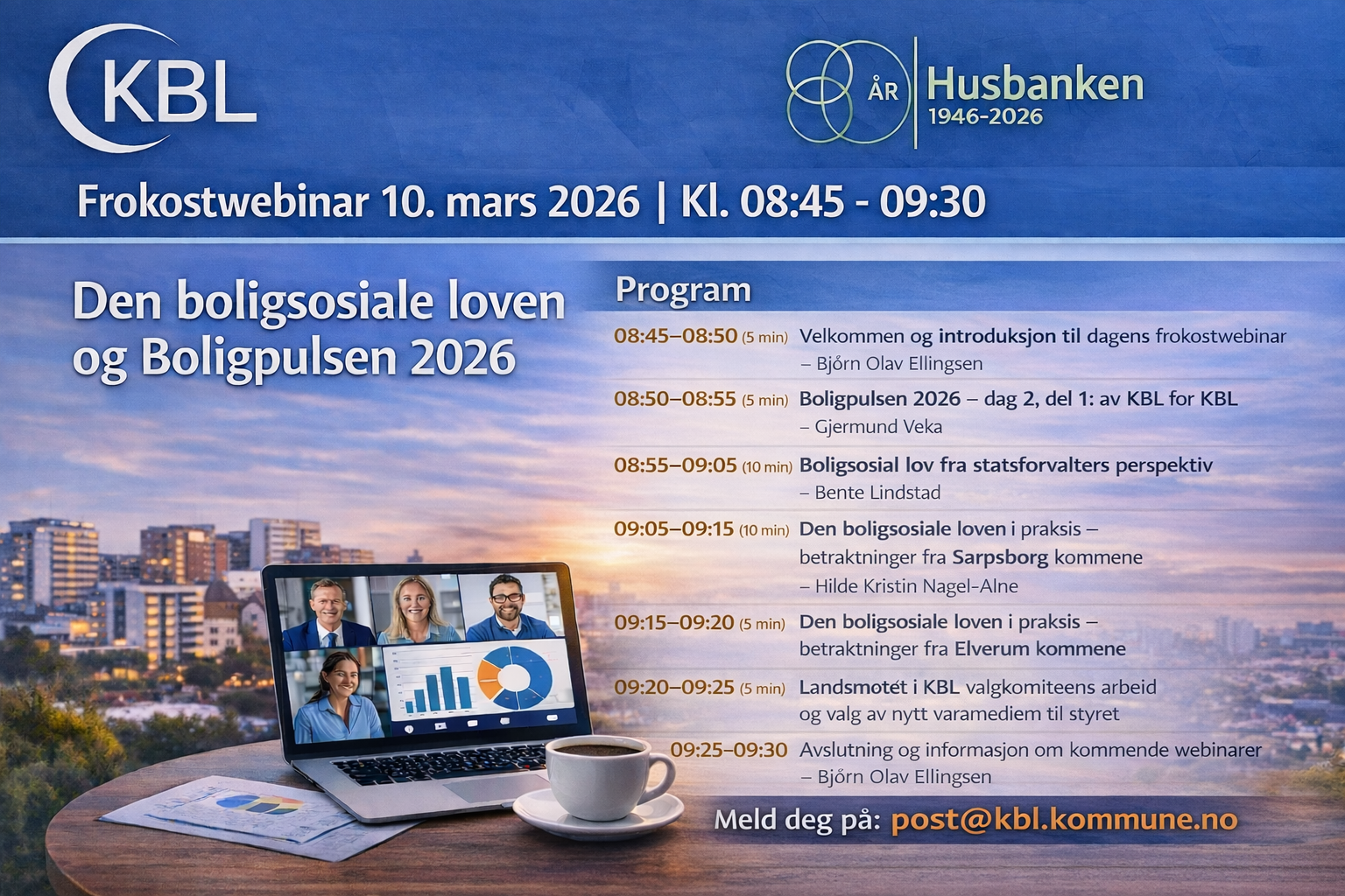 29/01/2026 - Gjermund Veka 0 KommentarerFrokostwebinar 10. februar: KBL gjenoppstår digitaltLes merKBL inviterer til frokostwebinar tirsdag 10. februar 2026 kl. 08:45–09:30. Webinaret markerer oppstarten av KBLs digitale satsing og byr på korte, relevante innlegg for kommunale boligaktører.